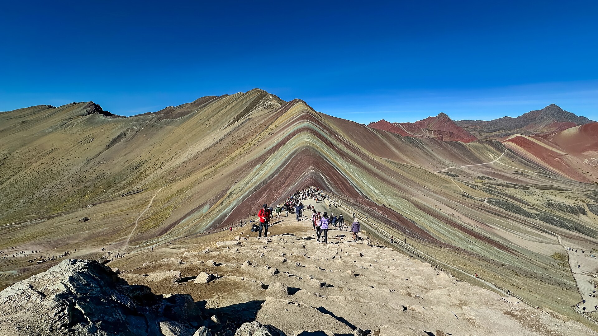 Rainbow Mountain (Vinicunca or Montaña de Siete Colores) is a geological wonder 100 kilometres southeast of Cusco — a mountain whose exposed sedimentary layers create stripes of red, yellow, green, turquoise, and lavender across its slopes, producing one of the most visually extraordinary landscapes in the Andes. The mountain was covered by glacial ice until recent decades, and the retreat of the glacier (a visible consequence of climate change) has revealed the coloured mineral deposits that were hidden for millennia. The hike to Rainbow Mountain is challenging — not because of the distance (about 5 kilometres each way) but because of the altitude (the trailhead is at 4,600 metres and the summit reaches 5,200 metres). At this elevation, every step is an effort, and acute mountain sickness is a genuine risk for visitors who haven't acclimatised. The standard advice is to spend at least 2-3 days in Cusco (3,400m) before attempting the hike. The colours are caused by different mineral deposits in the sedimentary layers — iron oxide (red), iron sulphide (yellow), chlorite (green), and other minerals creating the stripes that make the mountain look like a geological abstract painting. The mountain has become one of Peru's most-visited natural attractions since going viral on social media in the mid-2010s, and the trail can be crowded during peak season (May-October). The day trip from Cusco takes 10-12 hours including the 3-hour drive each way.