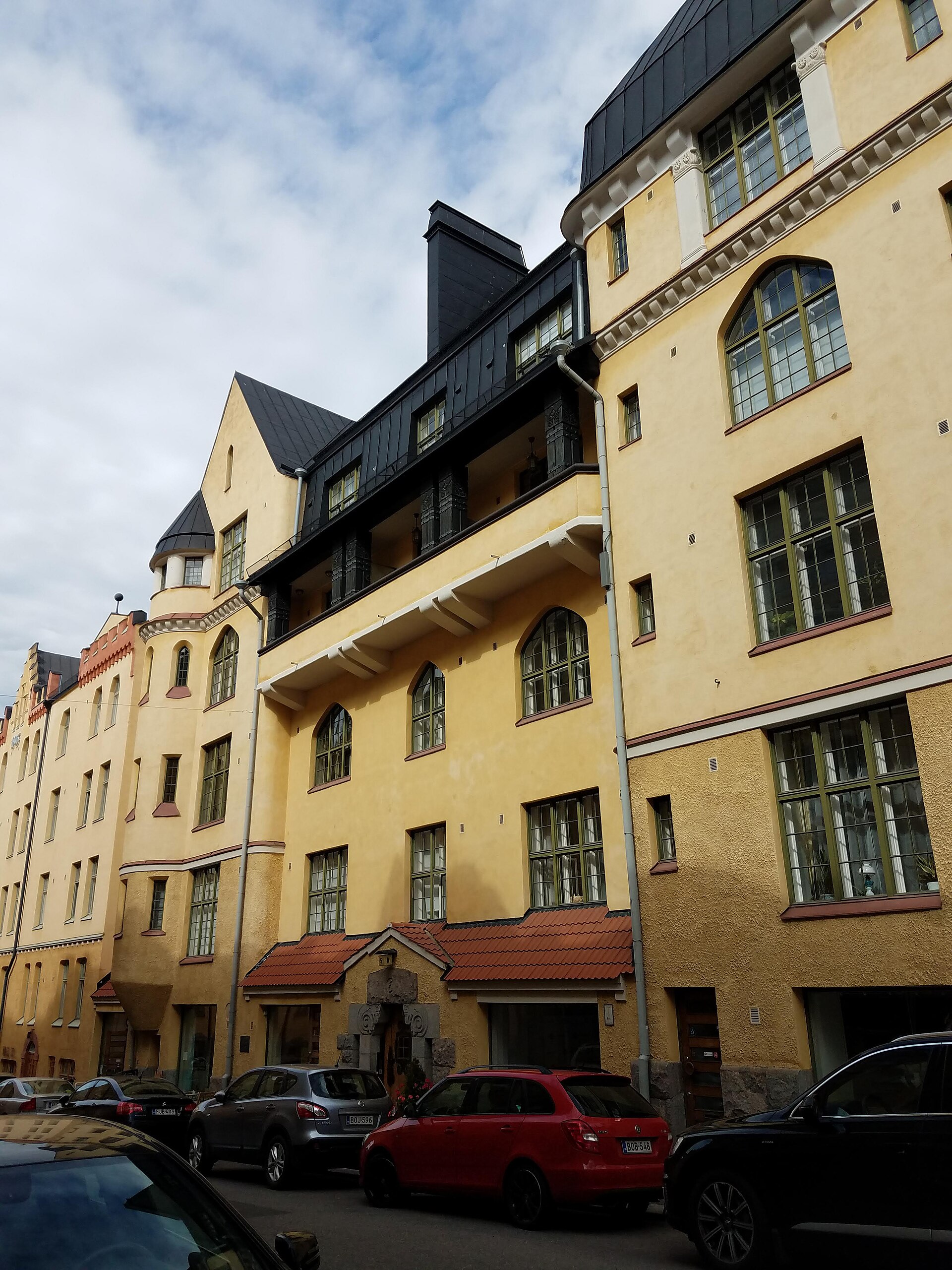 Katajanokka is Helsinki's finest Art Nouveau neighbourhood — a peninsula east of the Market Square where nearly every residential building was designed in the Finnish National Romantic or Jugendstil style between 1900 and 1910, creating a streetscape of carved stone facades, turrets, organic ornamentation, and the mythological creatures from Finnish folklore that the architects used as decorative motifs. Finnish Art Nouveau (known as Jugendstil, the German term) drew inspiration from the Kalevala, Finland's national epic, and from the country's natural landscape — bears, pine trees, squirrels, and the sinuous lines of northern forests appear on building facades throughout the district. The buildings on Luotsikatu, Vyökatu, and Kauppiaankatu are the finest examples, and walking the streets with your eyes on the upper floors reveals a density of decorative stonework that rivals Brussels or Barcelona for quality if not for quantity. Katajanokka is also home to the Uspenski Cathedral, the icebreaker fleet (visible in the harbour basin), and Hotel Katajanokka — a former county prison converted into a boutique hotel where guests sleep in renovated cells. The neighbourhood's residential character means it's quieter than the city centre, and the experience of walking streets where every building is a century-old work of decorative art — in a city that takes design seriously enough to maintain them — is one of Helsinki's great understated pleasures.