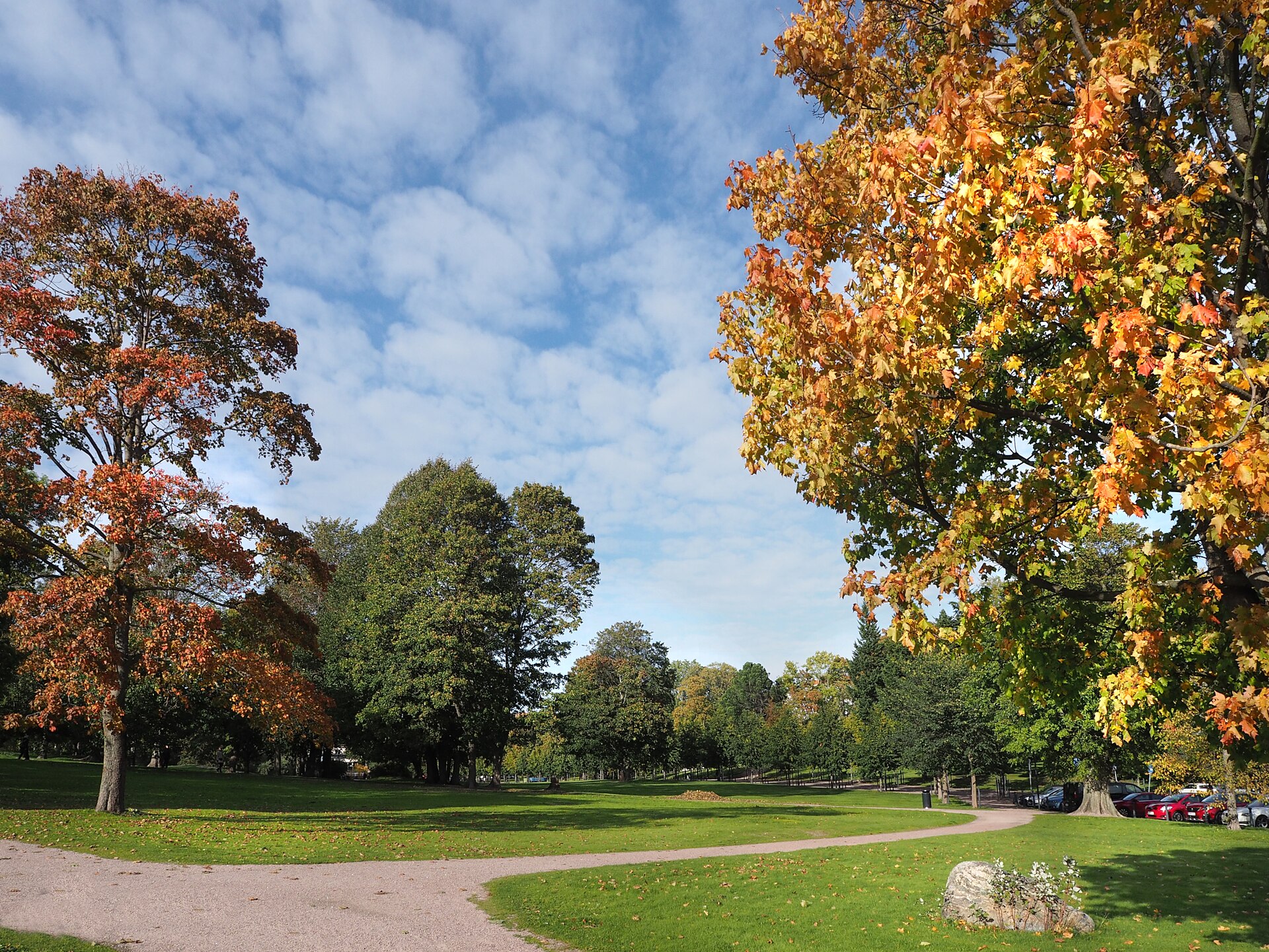 Kaivopuisto is Helsinki's oldest park and its most scenic — a seaside green space on the southern tip of the city peninsula that provides views across the harbour to Suomenlinna, the open Baltic, and the islands of the Helsinki archipelago. The park was established in the 1830s as a spa resort (kaivopuisto means 'well park,' named after the mineral spring that attracted the spa's original visitors) and has evolved into the neighbourhood park for Helsinki's most exclusive residential district. The park slopes from the embassy quarter at its northern edge down to a rocky shoreline where Helsinkians swim, picnic, and watch the ferries pass in summer. The view from the Ursa Observatory at the park's highest point — looking south across the water to the islands and the open sea beyond — is one of Helsinki's great panoramas, particularly at sunset when the western sky turns the water gold. Vappu (May Day, May 1) celebrations in Kaivopuisto are Helsinki's biggest annual outdoor event — tens of thousands of people gather with picnic blankets, champagne, and the white student caps that are the symbol of Finnish graduation tradition, creating an all-day celebration of spring's arrival that is part bacchanalian, part civic, and entirely Finnish. The park's cafés (Café Ursula on the waterfront is the most popular) serve throughout the summer, and the Mannerheim Museum (the preserved home of Finnish military leader Carl Gustaf Emil Mannerheim) sits on the park's northern edge.