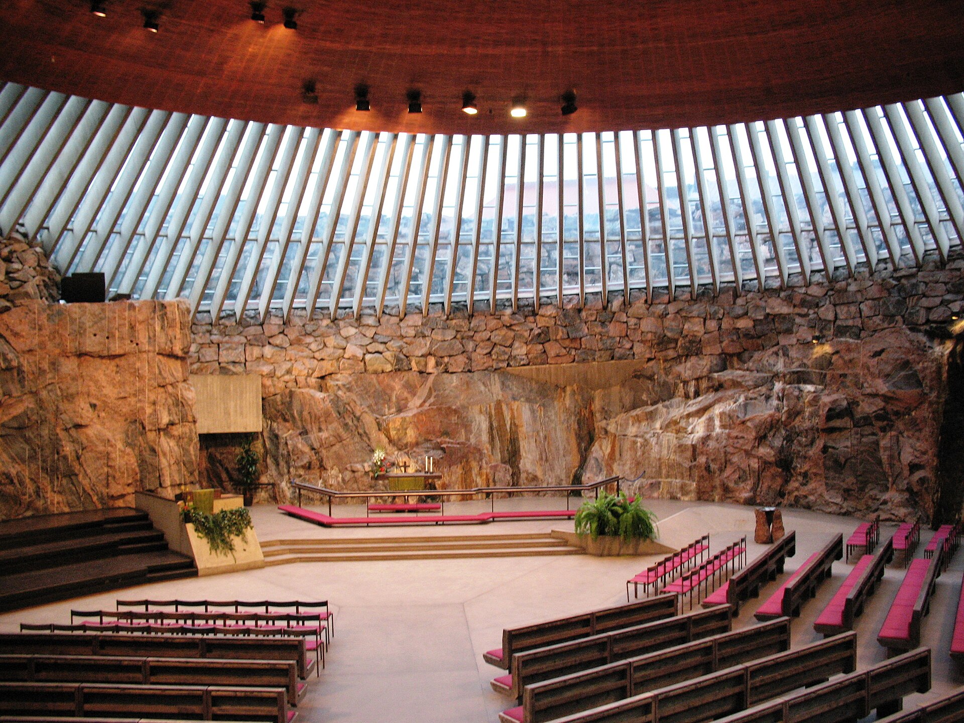Temppeliaukio Church is a church carved directly into solid granite — a circular space blasted out of a rocky outcrop in the Töölö neighbourhood and topped with a copper dome that spirals above a ring of windows letting natural light flood the rough stone walls. Completed in 1969 by architects Timo and Tuomo Suomalainen, it's the most visited church in Helsinki and one of the most architecturally significant religious buildings of the 20th century. The interior is extraordinary. The walls are raw, unfinished granite — the drill marks and blast patterns from the excavation are visible in the stone, and the acoustic properties of the rock, combined with the copper dome, create a natural reverberant space that makes the church one of the best concert venues in Helsinki. The ring of glass between the rock walls and the copper dome lets daylight enter horizontally, washing across the stone surface and creating patterns that change throughout the day. The church is nearly invisible from outside — the entrance is at ground level on a residential street, and the dome barely rises above the surrounding rock. The surprise of descending into a subterranean cathedral of raw stone after walking through an ordinary Helsinki neighbourhood is part of the design's power. The church hosts regular concerts (classical, choral, and the occasional rock performance that takes the venue's nickname literally), and the acoustics in the stone chamber are warm, full, and entirely unlike any conventional concert hall.