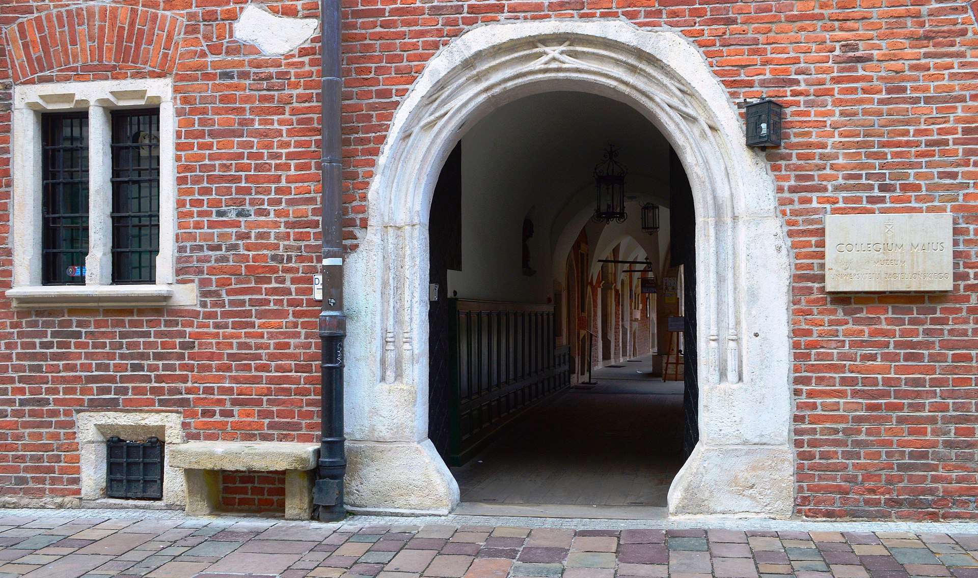 Collegium Maius is the oldest university building in Poland and one of the oldest in Europe, built in the 15th century for the Jagiellonian University — which itself was founded in 1364, making it the second-oldest university in Central Europe after Prague. Copernicus studied here. So did Pope John Paul II. The building wears its intellectual pedigree with appropriate gravitas. The Gothic arcaded courtyard is one of the most beautiful small spaces in Kraków — red brick arches on three sides, a well in the centre, and a gallery of pointed arches that belong more in a cloister than a university. Every day at noon, a mechanical clock above the courtyard plays a student song while carved wooden figures of university rectors parade across the clock face — a charming piece of academic self-celebration. The museum inside contains the university's collection of scientific instruments, including what's claimed to be the oldest surviving astronomical globe to show the Americas — the Jagiellonian Globe, made around 1510, just 18 years after Columbus. There are also medieval astronomical instruments, academic maces, and the lecture rooms where Copernicus sat in the 1490s working out that the Earth was not, in fact, the centre of the universe. Tours are required for the museum interior but the courtyard is free to enter.