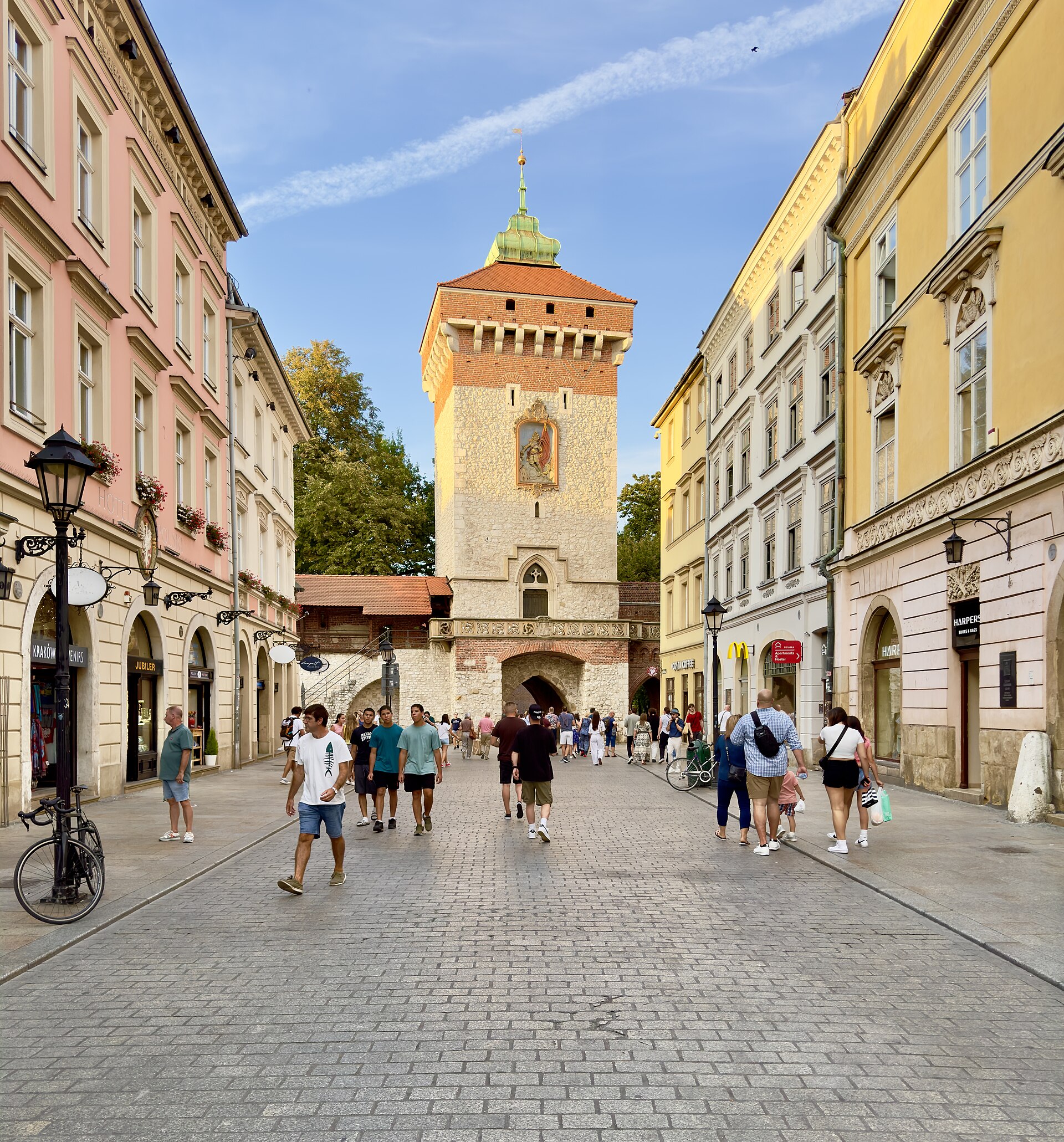 Floriańska Gate is the only surviving gate of Kraków's original medieval fortifications, and the street bearing its name that runs from the gate to the Main Square is the most historic walk in the city — a straight 335-metre line from the city walls to the heart of town that every Polish king, invading army, and tourist has walked for 700 years. The gate itself is a square Gothic tower from the 14th century, topped with a Baroque cap added later, with a small painting of the Madonna on the city-facing side that has been receiving prayers from travellers entering Kraków since the Middle Ages. Walking through the gate from the Planty side into the Old Town is one of those threshold moments that cities rarely offer anymore — you pass from 19th-century parkland into a medieval streetscape in a single step. Floriańska Street is lined with historic townhouses now occupied by restaurants, galleries, and shops, including Jama Michalika — a café that's been operating since 1895 and was the headquarters of Kraków's bohemian art scene in the early 1900s. The Art Nouveau interior, complete with satirical puppet shows from the Young Poland movement, is preserved as a functioning café-museum. Have a coffee and a szarlotka (Polish apple cake) in a room where the century-old wall paintings look down with mild disapproval.