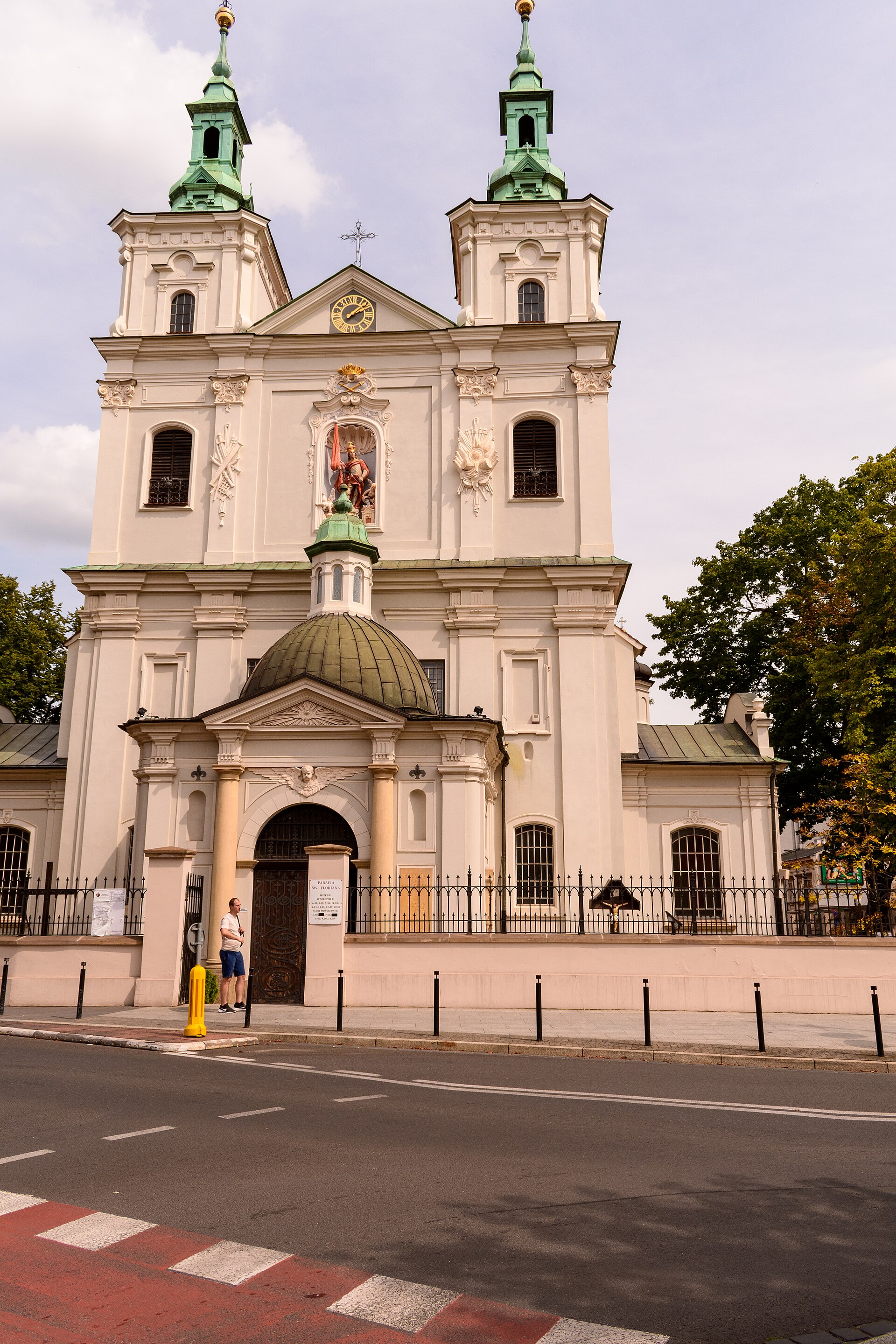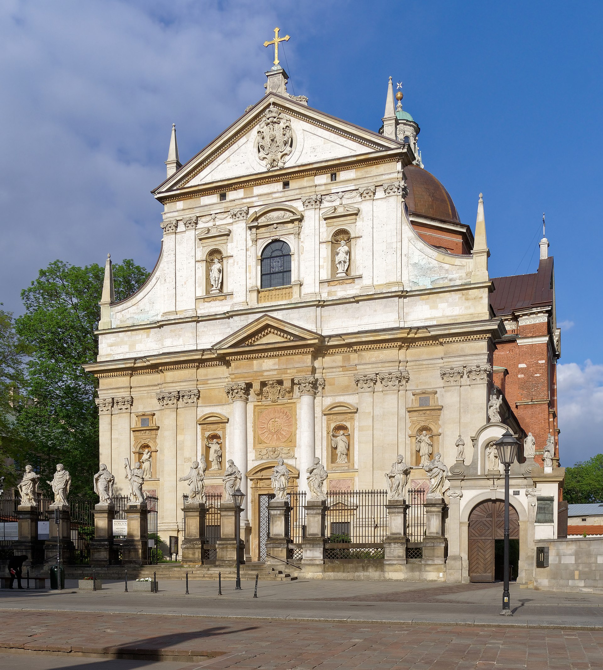 The Church of Saints Peter and Paul is the first Baroque building in Kraków and one of the finest in Poland — a white-faced Italian import on a street of Gothic and Renaissance neighbours that announced, when it was completed in 1635, that the Counter-Reformation had arrived and it had budget. The Jesuits built it to impress, and the façade — modelled on Il Gesù in Rome — succeeds spectacularly. The twelve apostle statues lining the fence in front of the church are the most photographed sculptures in Kraków. Carved in the early 18th century, they stand on pedestals like a receiving line, each identifiable by their traditional attributes — Peter with his keys, Paul with his sword, Andrew with his X-shaped cross. The originals were too weathered by pollution and had to be replaced with copies in the 1980s; the originals are inside. The interior is a single-nave barrel vault of white stucco that feels vast and bright after the dark Gothic churches elsewhere in the Old Town. The acoustics are extraordinary, and the church hosts regular classical concerts — Bach, Vivaldi, Chopin — that take full advantage of the Baroque space. A Foucault's pendulum hangs in the nave, swinging to demonstrate the Earth's rotation, which is either a statement about the church's relationship with science or just a very cool thing to put in a church.