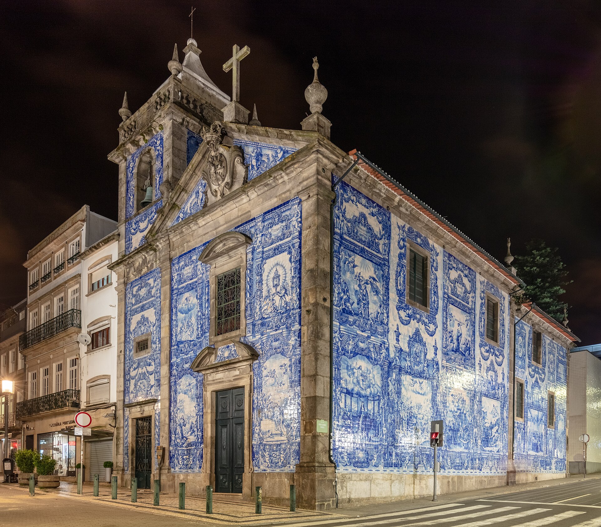 The Chapel of Souls is a small church on Porto's busiest shopping street that's entirely covered in blue and white azulejo tiles — all four exterior walls, from ground to roofline, wrapped in approximately 15,947 tiles depicting the lives and deaths of various saints with the graphic enthusiasm that 18th-century Portuguese Catholics brought to martyrdom. The tiles were actually installed in 1929, much later than most of Porto's azulejo facades, by Eduardo Leite in a deliberate attempt to replicate the 18th-century style. He succeeded so well that most visitors assume they're centuries older. The scenes include St. Francis of Assisi receiving the stigmata, St. Catherine's wheel, and the death of St. Francis, all rendered in the blue-on-white palette that makes Portuguese tile work instantly recognisable. The chapel sits on the corner of Rua de Santa Catarina and Rua de Fernandes Tomás — two of Porto's main commercial streets — which means you encounter it unexpectedly while walking between shops. The contrast between the commercial buzz of Santa Catarina and the serene blue facade is one of Porto's characteristic surprises. The interior is modest compared to São Francisco's golden excess, but the tile work outside is the real attraction. Come in the morning when the eastern light hits the facade and the blue tiles seem to glow.