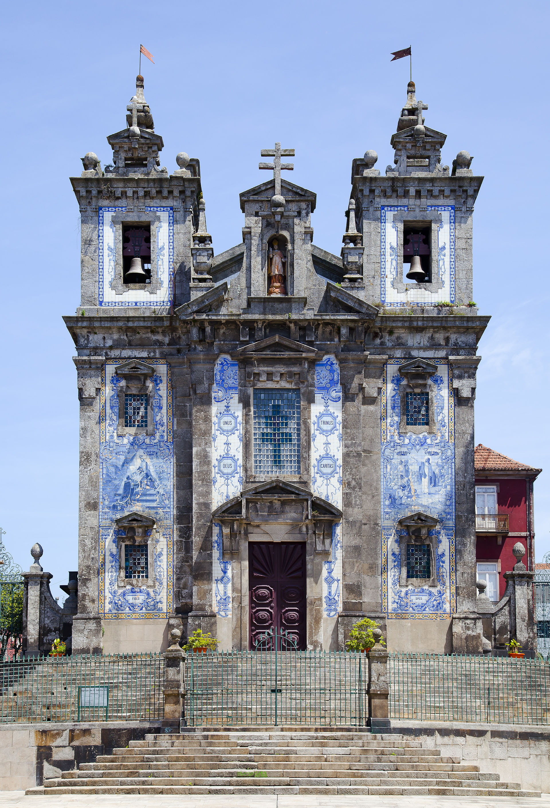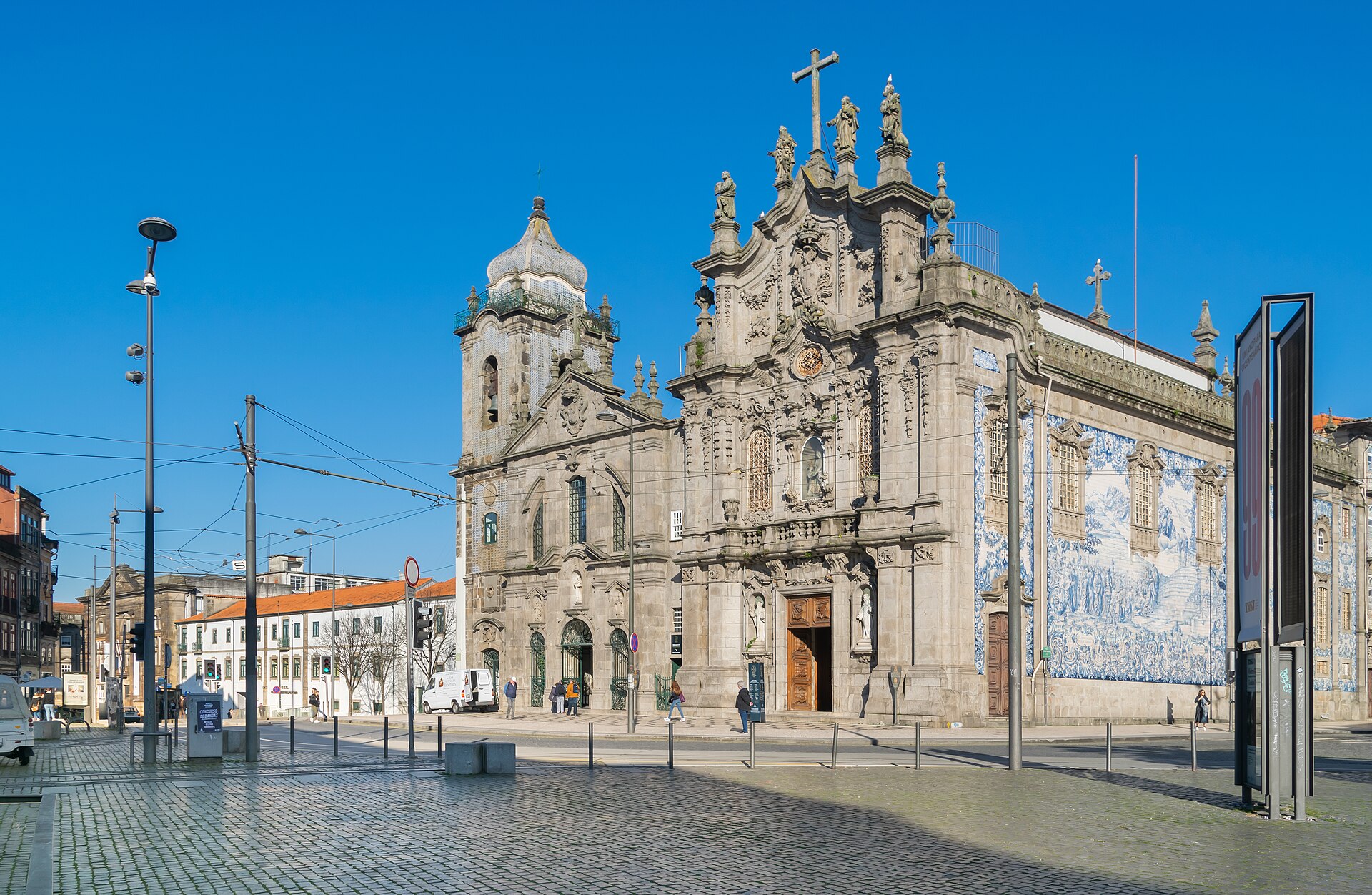 Two churches pressed so close together they share a wall — and the reason is one of the most absurd pieces of Portuguese bureaucracy in history. Canon law prohibited two churches from sharing a wall, so when the Carmo Church was built beside the Carmelite Church in the 18th century, a house exactly one metre wide was constructed between them to satisfy the rule. The narrowest house in Porto stands between two of its grandest churches, and it was occupied until the 1980s. The Carmo Church's side wall is the real attraction — a vast azulejo panel installed in 1912 depicting the founding of the Carmelite Order on Mount Carmel. It's one of the largest tile panels in Porto, covering the entire lateral façade in blue and white, and the scale is staggering when you round the corner and see it for the first time. The tiles were painted by Silvestro Silvestri and are in remarkable condition for being exposed to Atlantic weather for over a century. The interior of the Carmo is Baroque and gilded — Porto's default setting for church decoration — while the adjacent Carmelite Church (Igreja dos Carmelitas) is slightly earlier and slightly more restrained. The one-metre house between them is not open to the public, but you can see its tiny door from the side street, and imagining a family living in a space narrower than a hallway while flanked by two enormous churches is one of Porto's more entertaining mental exercises.