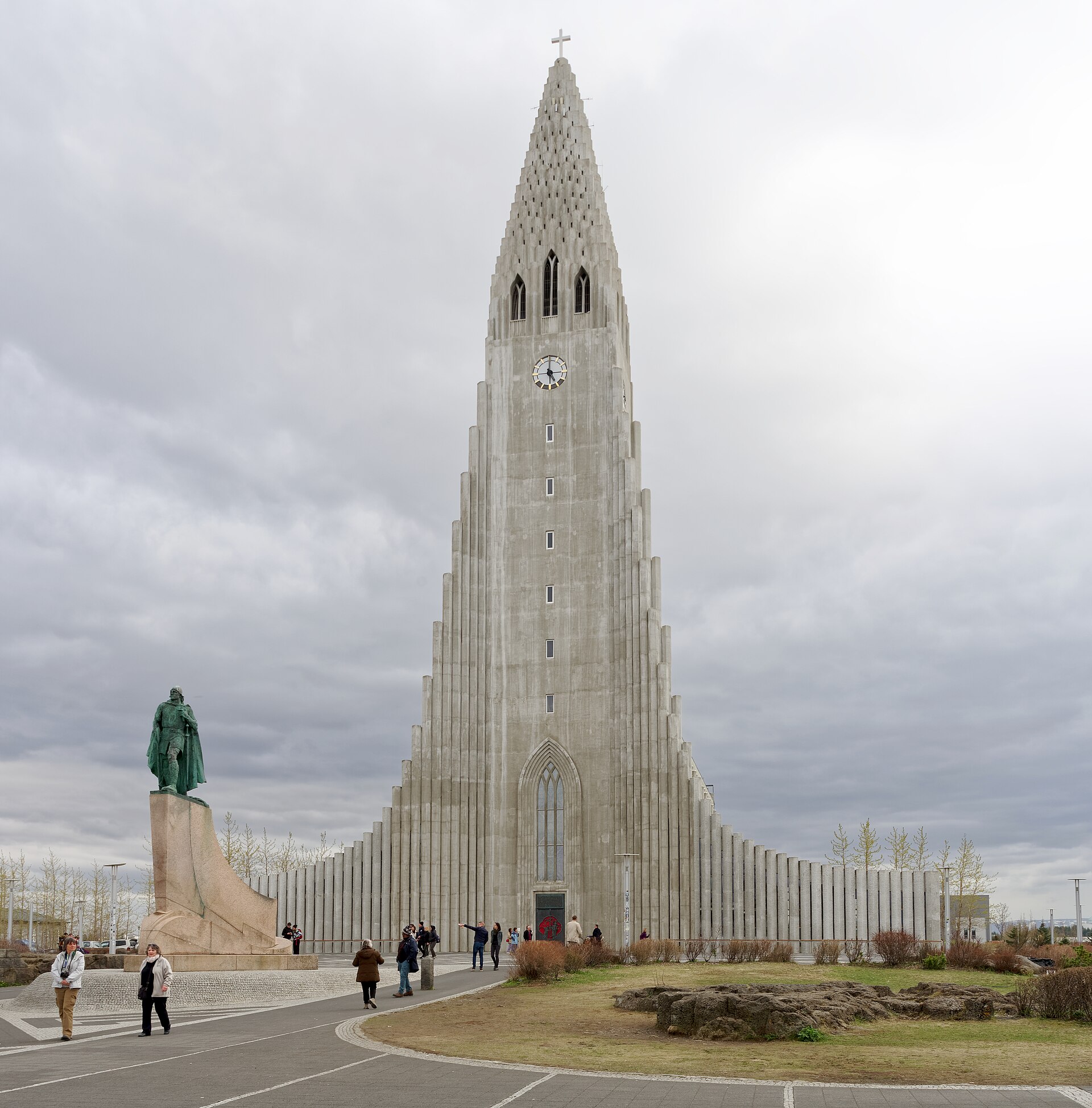 Hallgrímskirkja is Iceland's largest church and Reykjavik's most recognisable landmark — a 74.5-metre expressionist concrete tower designed by Guðjón Samúelsson in 1937 (but not completed until 1986) whose facade is shaped to evoke basalt columns, the hexagonal volcanic rock formations that define Iceland's landscape. The tower observation deck provides the best 360-degree view of Reykjavik — the colourful tin-roofed houses, the harbour, and on clear days the Snæfellsjökull glacier 120 kilometres across the bay. The church took 41 years to build (Icelandic construction moves at the pace of a country with 330,000 people and long winters), and the organ inside — a 5,275-pipe instrument built by Johannes Klais of Bonn — is one of the largest in Europe. The statue of Leif Erikson in front of the church (donated by the United States in 1930 for Iceland's Alþingi millennium) points west toward North America, which Leif reached 500 years before Columbus.