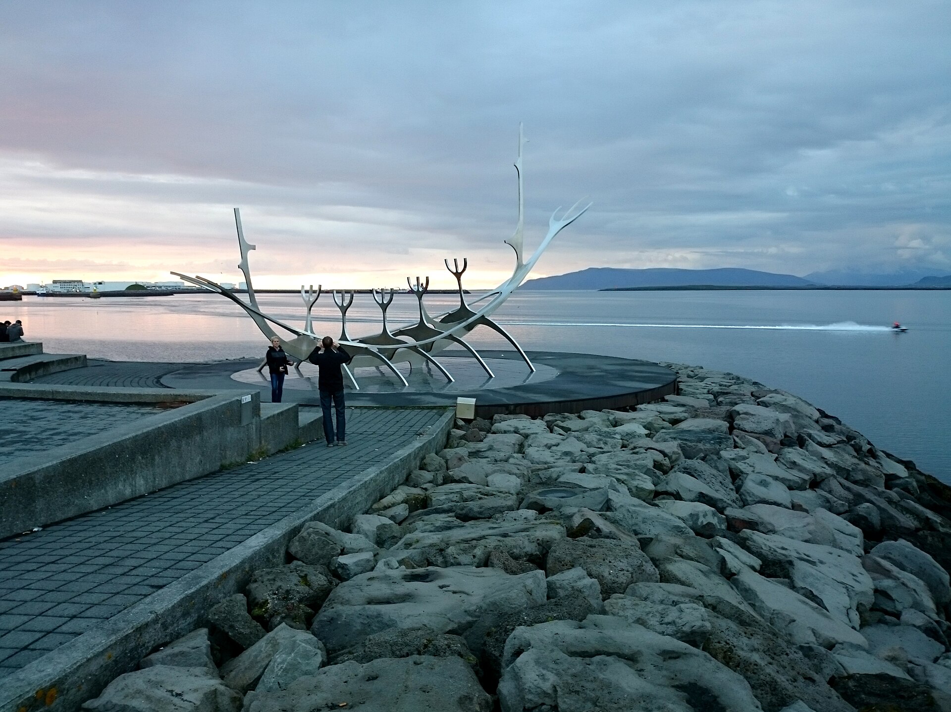 The Sun Voyager is Reykjavik's most photographed sculpture — a stainless steel representation of a Viking longship by Jón Gunnar Árnason, installed on the harbour front in 1990. The sculpture faces north across Faxaflói Bay toward the mountains of the Esja range, and the combination of steel, water, and the Icelandic light (which at northern latitudes has a quality of clarity and colour that lower latitudes can't produce) makes the Sun Voyager one of the most photogenic public artworks in any Nordic city. The sculpture is not a Viking ship — Árnason described it as 'a dream boat, an ode to the sun, symbolising the promise of undiscovered territory, a dream of hope, progress, and freedom.' The abstract form suggests a vessel without specifying one, which makes it simultaneously a reference to Iceland's seafaring history and a universal symbol of exploration. The sculpture sits on the Sæbraut waterfront promenade, and the sunset behind the Esja mountains with the Sun Voyager in silhouette is the most popular photograph taken in Reykjavik.