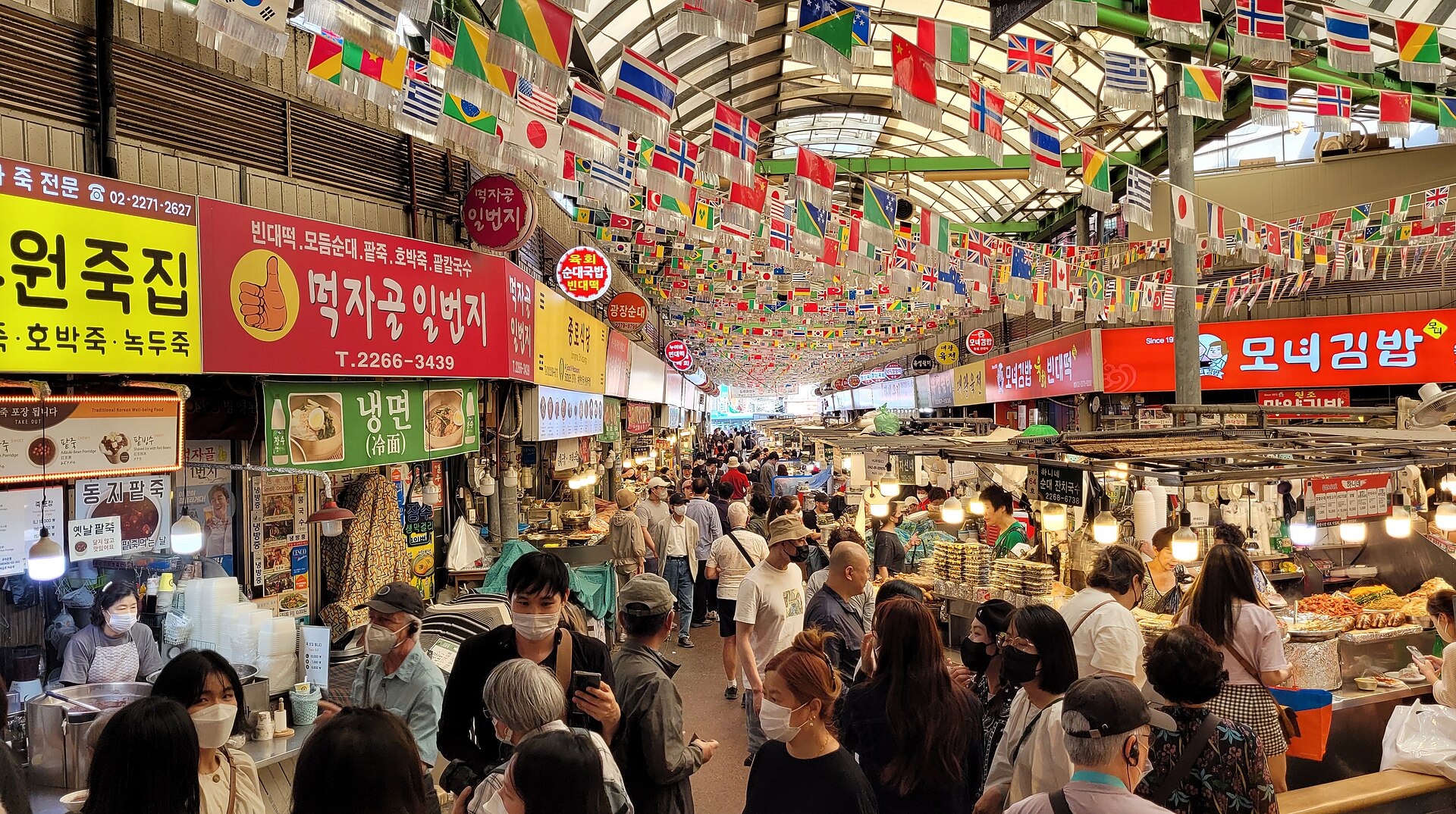 Gwangjang Market is Korea's first permanent market — established in 1905, and now a sprawling, chaotic, magnificent food hall where the stall vendors have been perfecting the same dishes for generations and the communal seating puts you elbow-to-elbow with Korean grandmothers, office workers on lunch break, and tourists who've seen the market on Netflix and are trying to figure out what to order. The food hall, concentrated in the covered alleys on the market's eastern side, is the main attraction. Bindaetteok (mung bean pancakes, fried to a crisp on enormous griddles by women who've been making them for 30 years), mayak gimbap ('addictive' mini rice rolls dipped in mustard sauce), tteokbokki (chewy rice cakes in fiery gochujang sauce), and yukhoe (Korean beef tartare, served raw with a quail egg on top) are the signature dishes. Each stall specialises in one or two items, and the vendors will make sure you order correctly even if you don't speak Korean — pointing and nodding are an adequate ordering system. The market also houses an enormous textile section — bolts of silk, cotton, and synthetic fabric stacked floor to ceiling in hundreds of stalls, along with tailors who can produce a custom hanbok or suit overnight. The vintage clothing section, the dried goods alleys, and the secondhand shops round out a market that covers about 42,000 square metres and has been operating continuously since the Japanese colonial period. Come hungry, bring cash (many stalls are cash-only), and budget at least an hour for eating and wandering.
