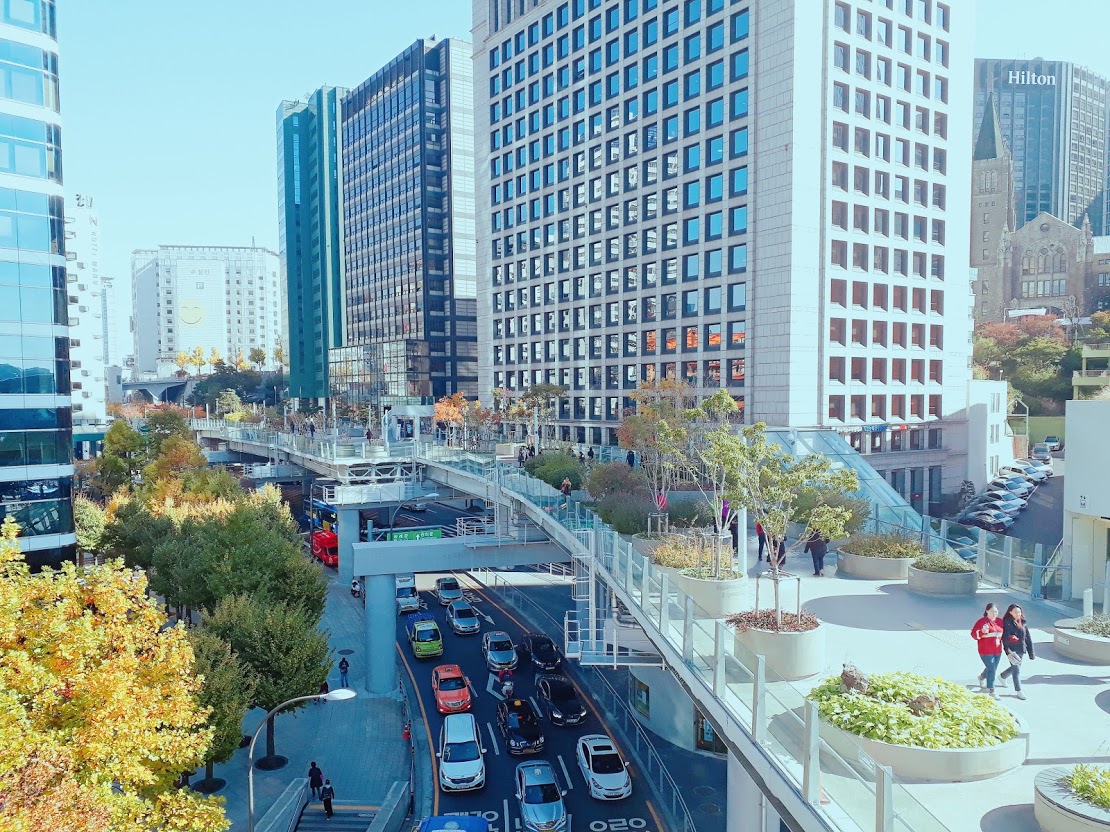 Seoullo 7017 is Seoul's answer to New York's High Line — a 983-metre elevated pedestrian garden built on a 1970 highway overpass near Seoul Station that was converted in 2017 from a crumbling road into a linear park planted with 24,000 trees and plants. The name combines '70' (built in 1970) with '17' (reborn in 2017), and the concept — turning automotive infrastructure into green public space — reflects Seoul's broader effort to reclaim the city from cars. The design, by Dutch firm MVRDV, organises 645 planters along the elevated walkway in a pattern that creates a botanical garden above the traffic: the plants are arranged by Korean name in Korean alphabetical order, creating a 'plant dictionary' that you walk through from ㄱ to ㅎ. Seating areas, performance spaces, cafés, and trampolines for children are scattered along the route, and the elevated perspective gives you views of Seoul Station (a Japanese colonial-era building), the old city wall, Namdaemun Market, and the surrounding neighbourhood that you can't see from street level. The walkway connects Seoul Station to Namdaemun Market and the Malli-dong neighbourhood, making it a practical pedestrian link as well as a park. Evening visits are best — the lighting design makes the planters and walkway glow, and the views of the city at night from an elevated garden have a quality that ground-level parks can't match. The park is free, open until 11pm, and accessible from Seoul Station subway.