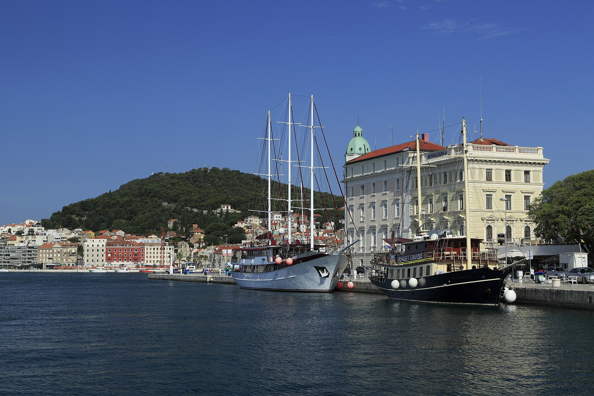 The Riva is Split's waterfront promenade — a palm-lined boulevard along the southern wall of Diocletian's Palace that is the city's daily gathering place, evening passeggiata route, and the spot where Splitčani have been drinking coffee and watching the harbour since the promenade was built in the 19th century. The Riva faces south across the harbour to the Marjan peninsula, and the afternoon sun that bathes the white stone in golden light creates the Mediterranean atmosphere that makes Split feel more Italian than Slavic. The café culture on the Riva is Split's most important social institution — the tables that line both sides of the promenade fill from morning through late evening with an unhurried procession of coffee drinkers who treat the Riva as an office, a living room, and a stage.