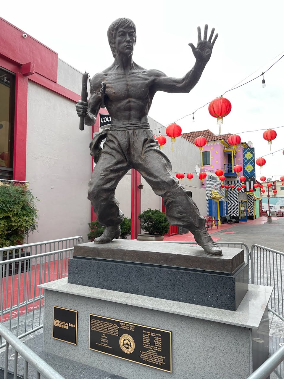 LA's Chinatown is the second Chinatown on this site — the original (founded in the 1870s) was demolished to build Union Station, and the current neighbourhood was established in 1938 as the first planned Chinatown in America, designed by Chinese-Americans rather than imposed by outside developers. The central plaza, with its pagoda-style buildings and the neon 'Chinatown' sign, was designed to attract tourists from the nearby Union Station while providing a genuine commercial hub for the Chinese-American community.