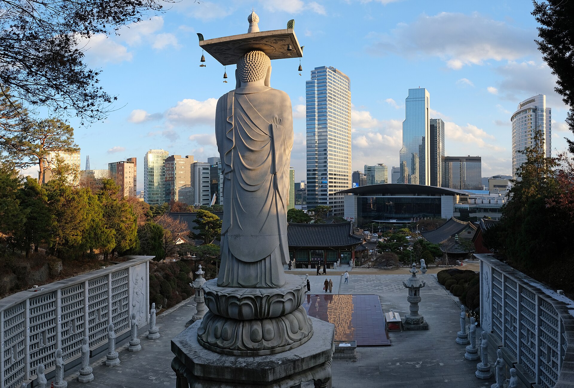 The exterior is covered in 45,133 aluminium panels, each individually curved, that create a continuous surface flowing from the park-like roof (which you can walk on) down to the street-level plazas. At night, the LED lighting embedded in the facade creates a soft glow that makes the building look like a landed spacecraft, and the 24-hour design market (DDP is open round the clock) adds a nocturnal energy that most cultural institutions lack. The night market on the outdoor plaza — a rotating collection of food stalls, craft vendors, and K-culture merchandise — draws a younger crowd that uses the building as a backdrop for Instagram photos.