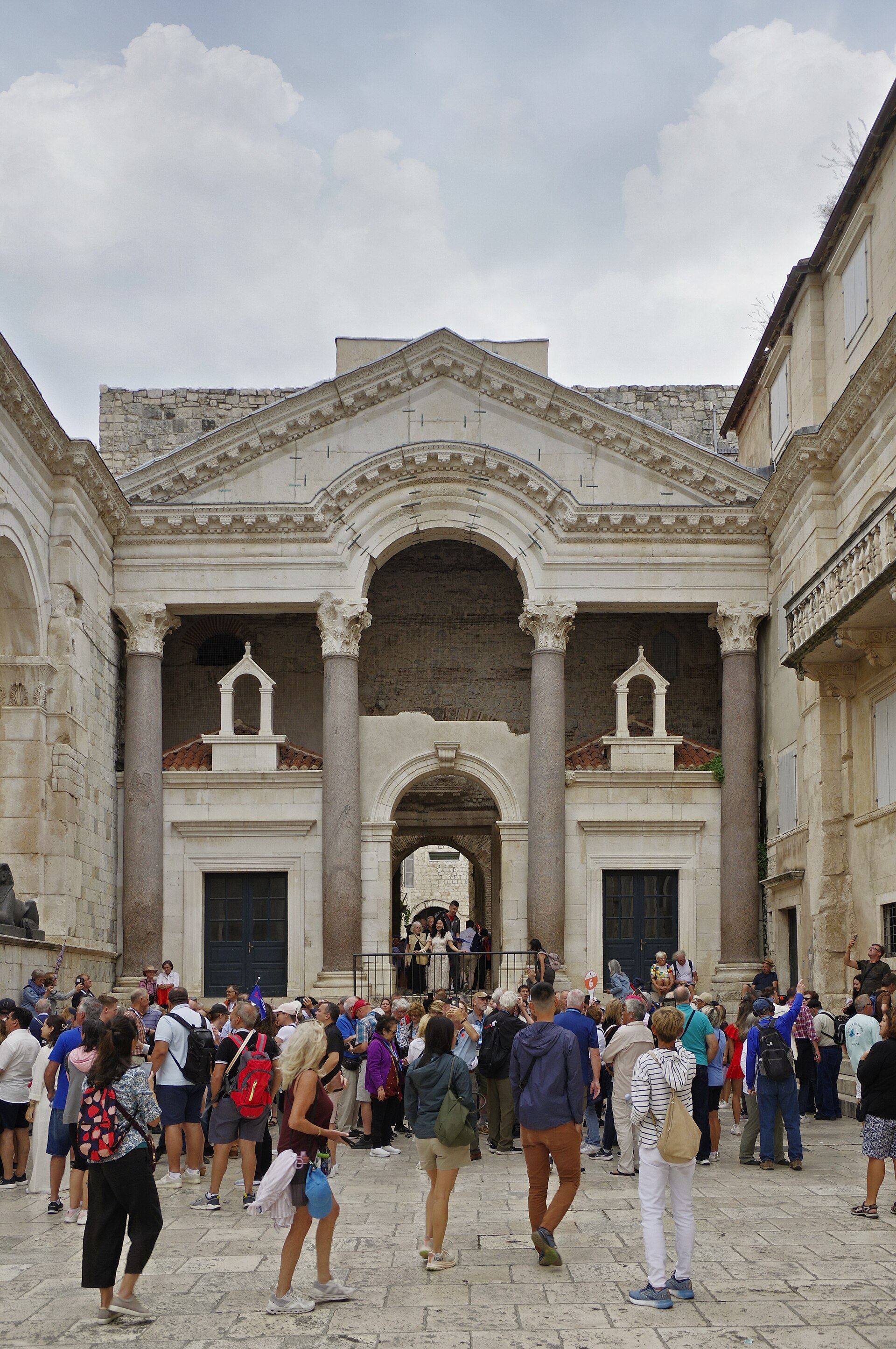 The Peristyle — the palace's central courtyard, flanked by granite columns brought from Egypt — is the living room of Split, where visitors sit on the ancient steps, musicians perform, and the cathedral bell tower (added in the 13th century to Diocletian's octagonal mausoleum) rises above. The basement halls (substructures) beneath the palace, which mirror the layout of the imperial apartments above and were used for storage, provide the most complete surviving example of Roman palace architecture.